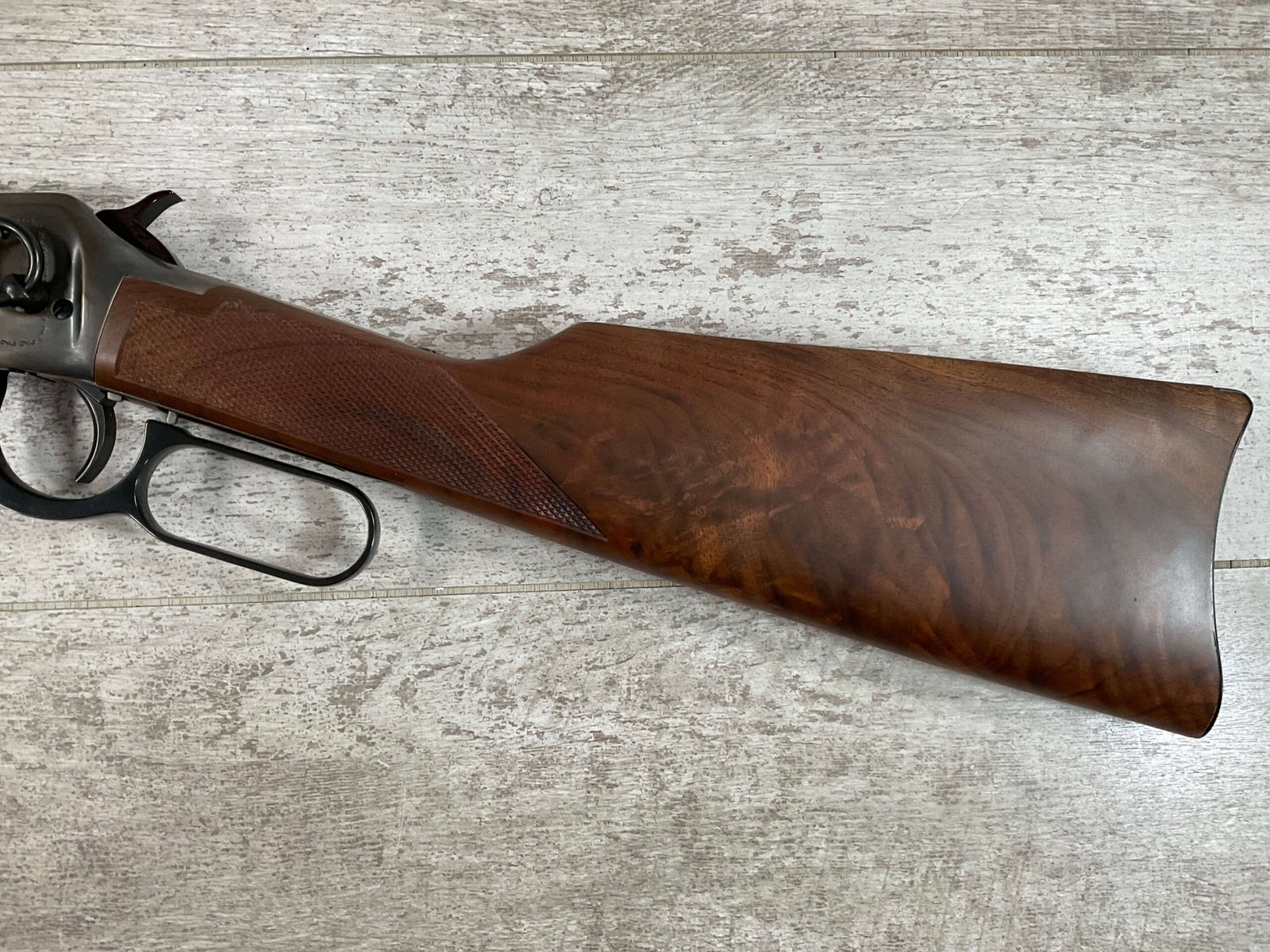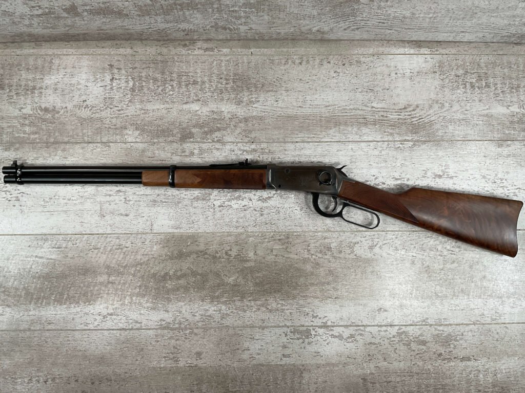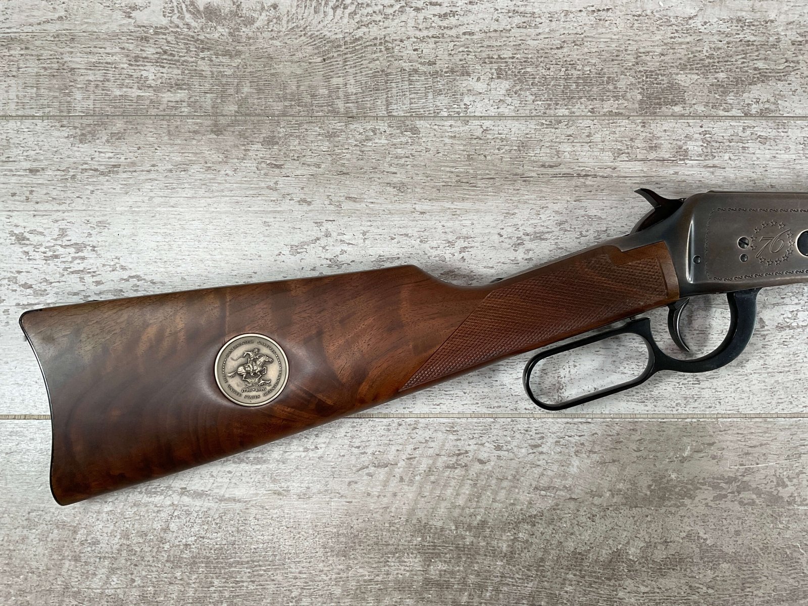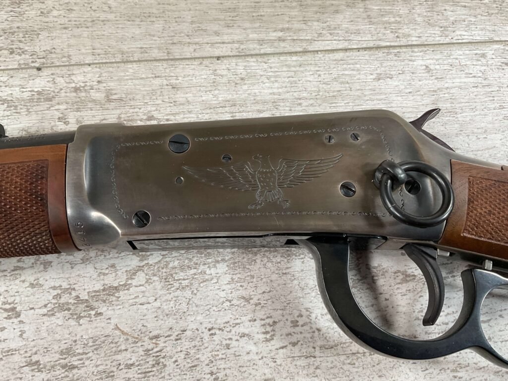 THE FIREARM IS IN A SADDLE RING CARBINE CONFIGURATION AND SHOWS A DELUXE WALNUT CHECKERED WOOD STOCK WITH INLAID SILVER COIN MARKED, “WINCHESTER SALUTES THE UNITED STATES BICENTENNIAL 1776-1976.” THE RECEIVER SHOWS A SILVER FINISH WITH FACTORY ENGRAVING. LEFT SIDE MARKED WITH AN ENGRAVED BORDER AND US BALD EAGLE. THE RIGHT SIDE IS MARKED WITH AN ENGRAVED BORDER AND 76 SURROUNDED BY 13 STARS. IN ORIGINAL SHIPPING BOX WITH WINCHESTER CUSTOM DESIGN WALL RACK TO DISPLAY THE RIFLE.