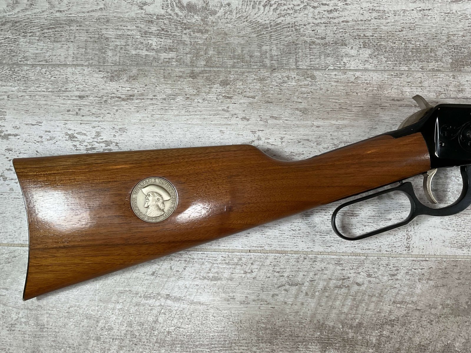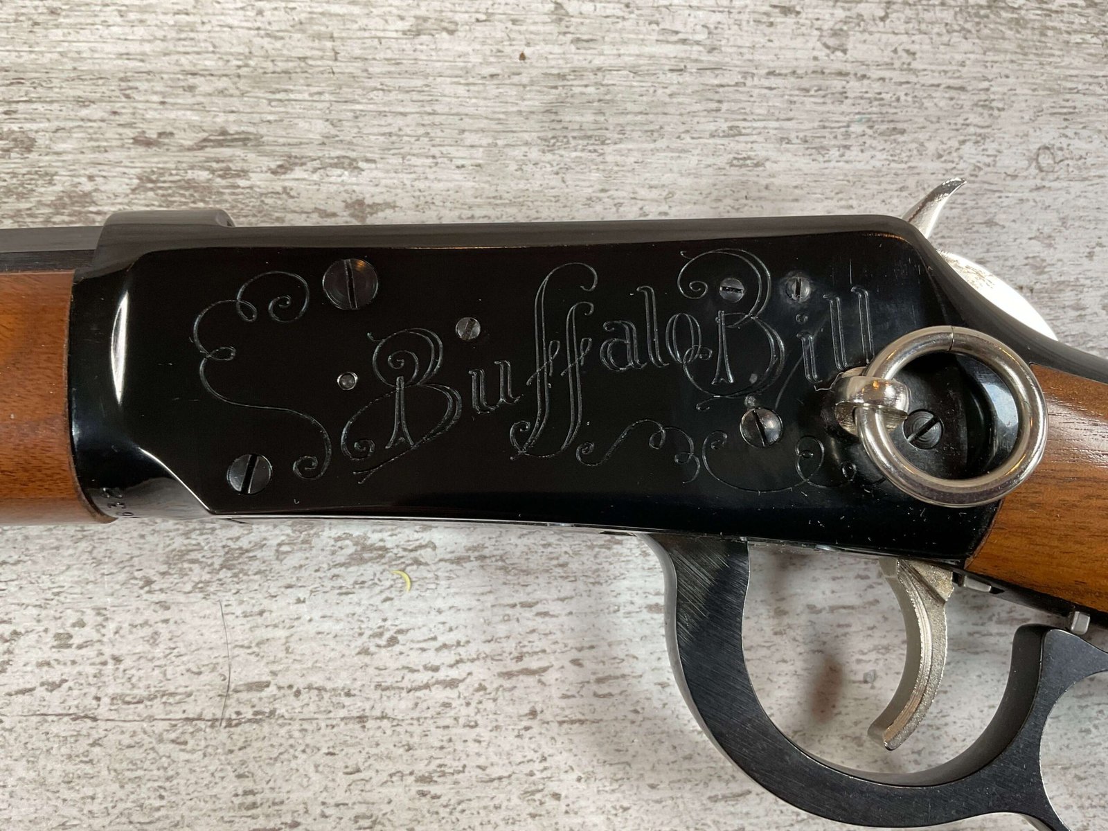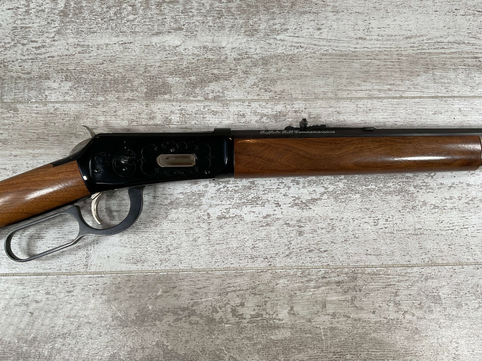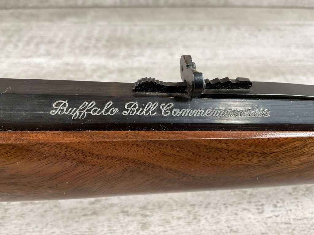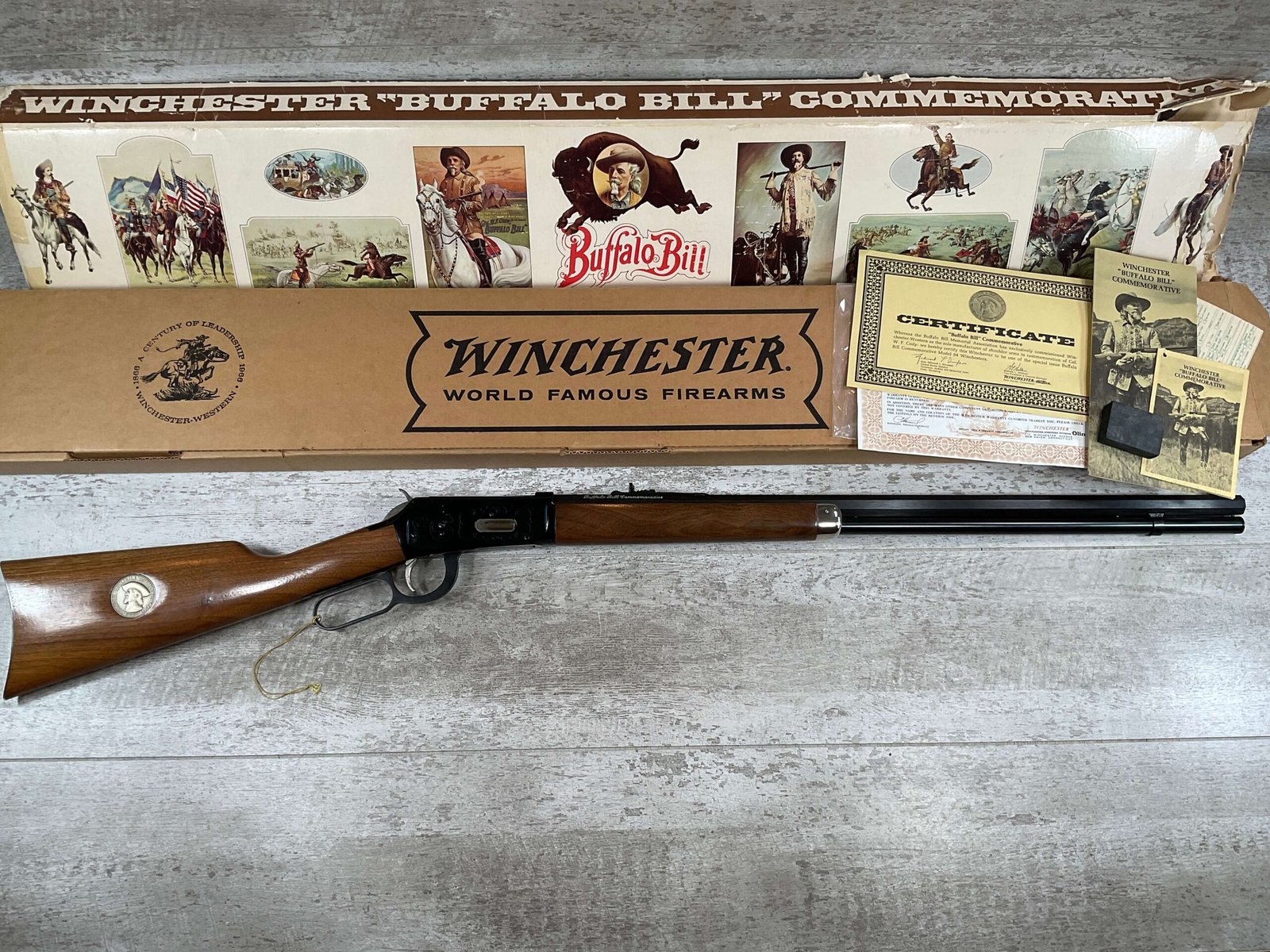 WINCHESTER MODEL 94 “BUFFALO BILL” COMMEMORATIVE .30-30 LEVER ACTION RIFLE #WC26632, LNIB, NEVER FIRED, 20″ OCT BARREL, ENGRAVED RECEIVER, SILVER SADDLE RING/TRIGGER/HAMMER/LOCKING BLOCK/FORENED CAP/BUTTPLATE/LOADING GATE, DELUXE WALNUT STOCK W/MEDALLION INLAID, BOX, EXC BRIGHT & SHINY BORE, EXC OVERALL UNFIRED CONDITION, MINTY