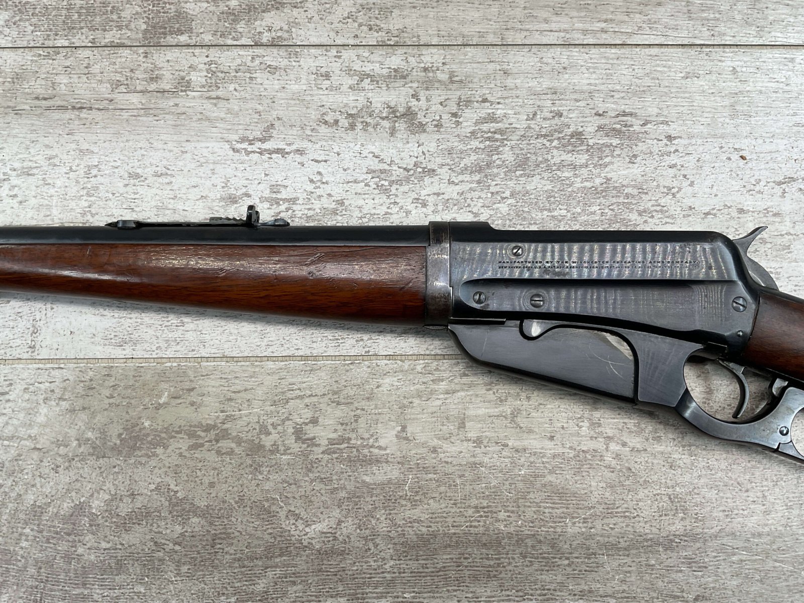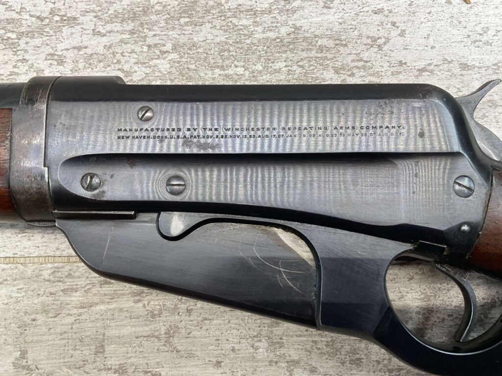 WINCHESTER MODEL 95 .35 WCF LEVER ACTION TAKEDOWN RIFLE #64534, 1909 MFR, 24″ ROUND BBL, VG BLUE W/LIGHT SCRATCHES ON RECEIVER & LIGHT HIGH EDGE WEAR, FIXED FRONT SIGHT W/ADJ BUNNY EAR REAR SIGHT, FURNITURE HAS A DARK CHERRY COLOR IN VG CONDITION, LIGHT COMPRESSION MARKS FROM USE, EBONY CENTER FEATURE AT THE END OF THE FOREARM, CUSTOM ORDER SHOTGUN STOCK WITH FLAT PLASTIC BUTT-PLATE, A GREAT HISTORICAL HIGHLY SOUGHT-AFTER FIREARM.