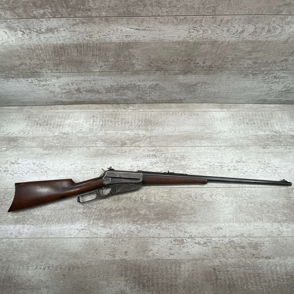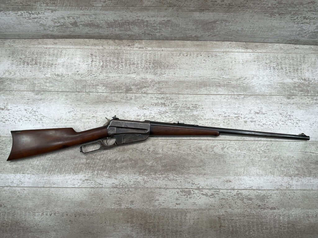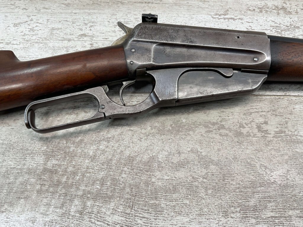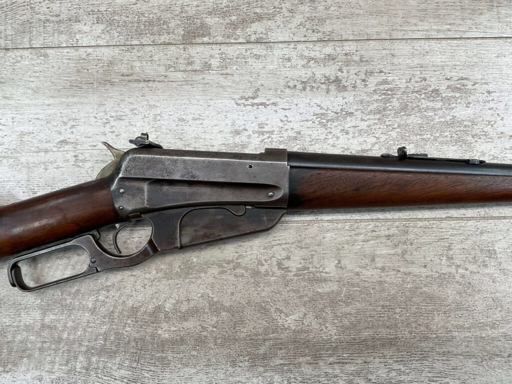 WINCHESTER MODEL 95 405 CAL. LEVER ACTION RIFLE, MFG 1904 .405 WCF #46168,  24″ ROUNND BBL, ORIGINAL BLUEING HAS TURNED SILVER GREY PATINA, BARREL IS STAMPED ON LEFT SIDE “NICKEL STEEL BARREL” OVER “ESPECIALLY FOR SMOKELESS POWDER” TOP OF THE BARREL IS STAMPED “405 WCF”,  FIXED FRONT SIGHT, THE CENTER SIGHT IS BUNNY EAR ADJUSTABLE, THE REAR SIGHT IS A RARE FACTORY-INSTALLED ORIGINAL LYMAN’S ADJUSTABLE SIGHT W/ PEEP REDUCTION, LEVER ACTION WITH 13″ LOP, BORE IS BRIGHT W/ GOOD RIFLING & LIGHT FROSTING THROUGHOUT, WOOD FOREARM IN VG CONDITION W/ORIGINAL EBONY END DETAIL, WOOD STOCK HAS LIGHT COMPRESSION MARKS FROM USE, ORIGINAL METAL CRESCENT  BUTTPLATE, LEVER ACTION W/CRISP TRIGGER &  TIGHT CLOSE, RARE IN THIS CONDITION!