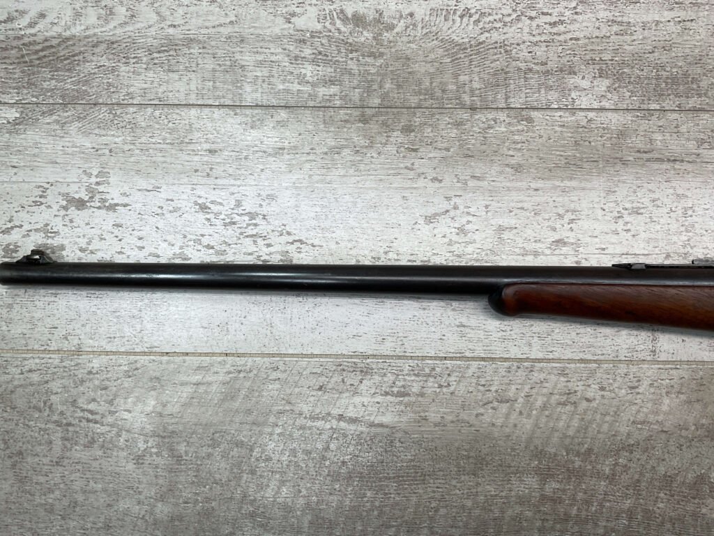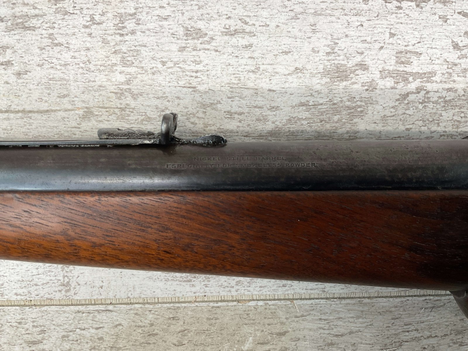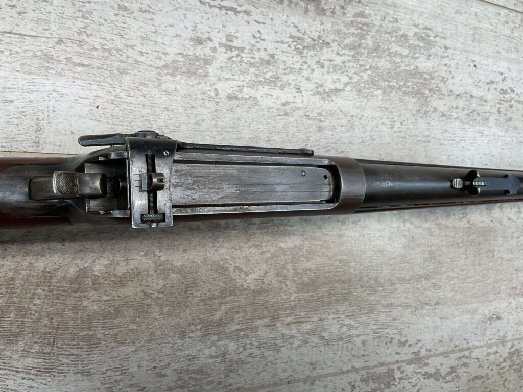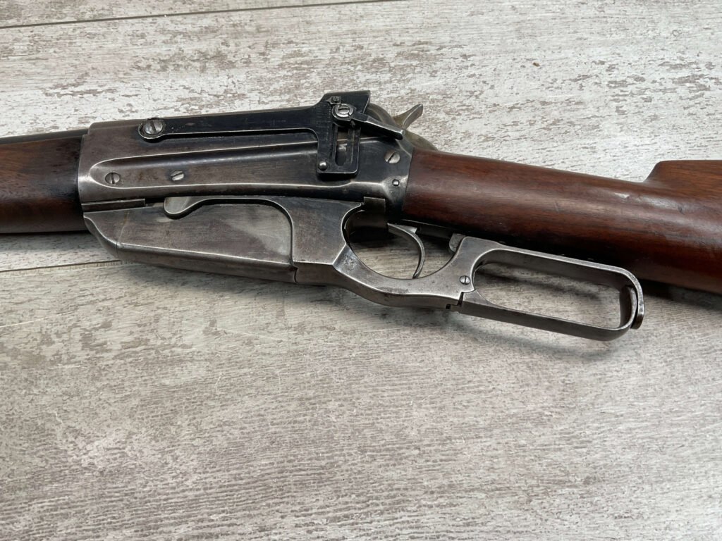 WINCHESTER MODEL 95 405 CAL. LEVER ACTION RIFLE, MFG 1904 .405 WCF #46168,  24″ ROUNND BBL, ORIGINAL BLUEING HAS TURNED SILVER GREY PATINA, BARREL IS STAMPED ON LEFT SIDE “NICKEL STEEL BARREL” OVER “ESPECIALLY FOR SMOKELESS POWDER” TOP OF THE BARREL IS STAMPED “405 WCF”,  FIXED FRONT SIGHT, THE CENTER SIGHT IS BUNNY EAR ADJUSTABLE, THE REAR SIGHT IS A RARE FACTORY-INSTALLED ORIGINAL LYMAN’S ADJUSTABLE SIGHT W/ PEEP REDUCTION, LEVER ACTION WITH 13″ LOP, BORE IS BRIGHT W/ GOOD RIFLING & LIGHT FROSTING THROUGHOUT, WOOD FOREARM IN VG CONDITION W/ORIGINAL EBONY END DETAIL, WOOD STOCK HAS LIGHT COMPRESSION MARKS FROM USE, ORIGINAL METAL CRESCENT  BUTTPLATE, LEVER ACTION W/CRISP TRIGGER &  TIGHT CLOSE, RARE IN THIS CONDITION!