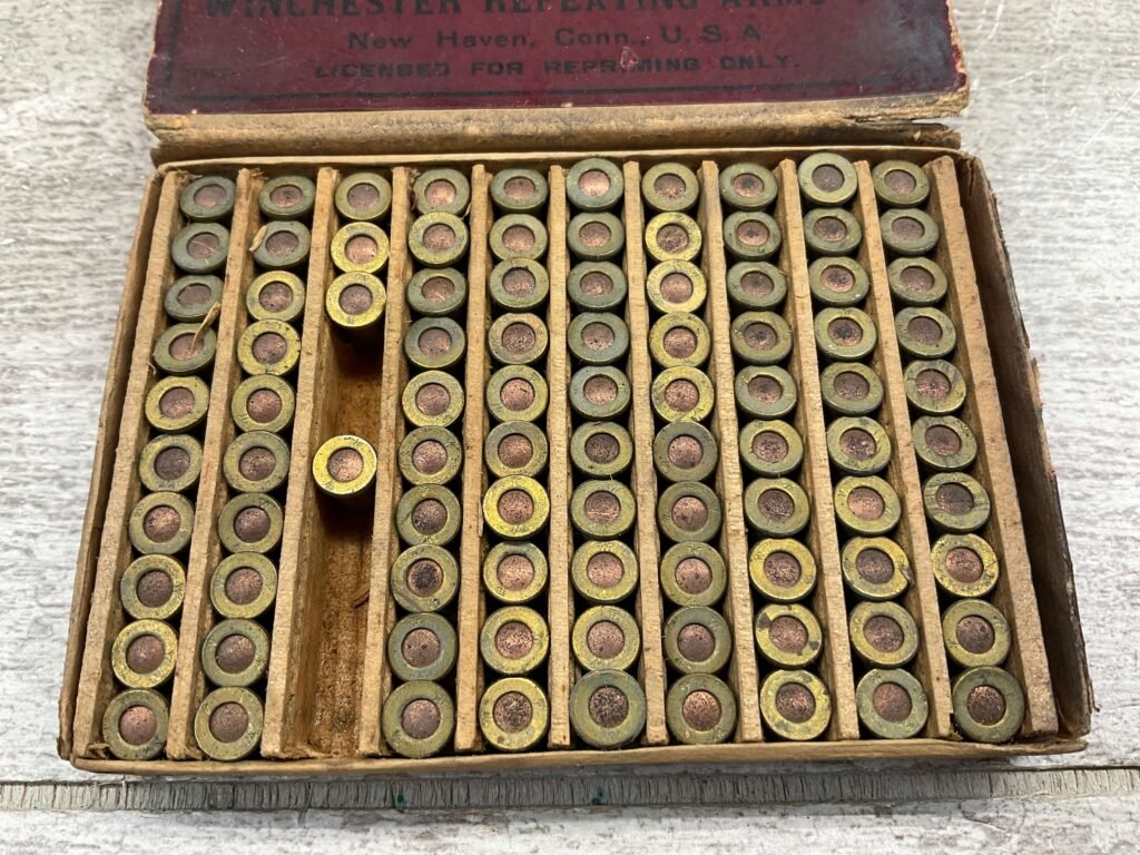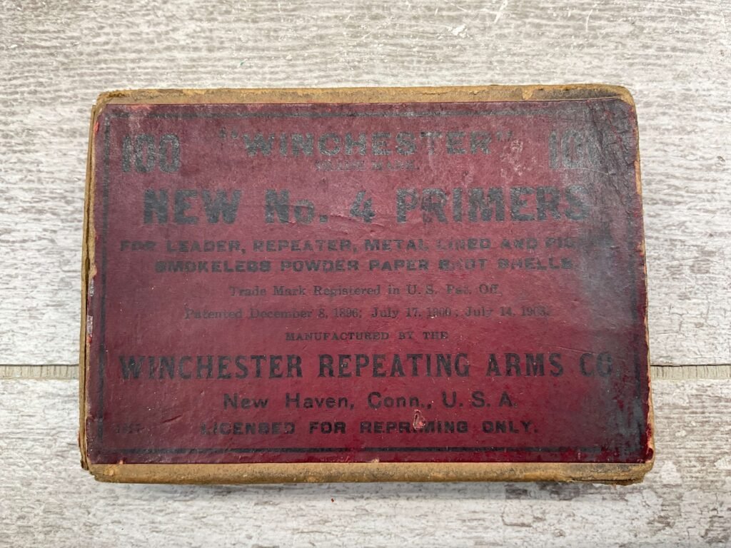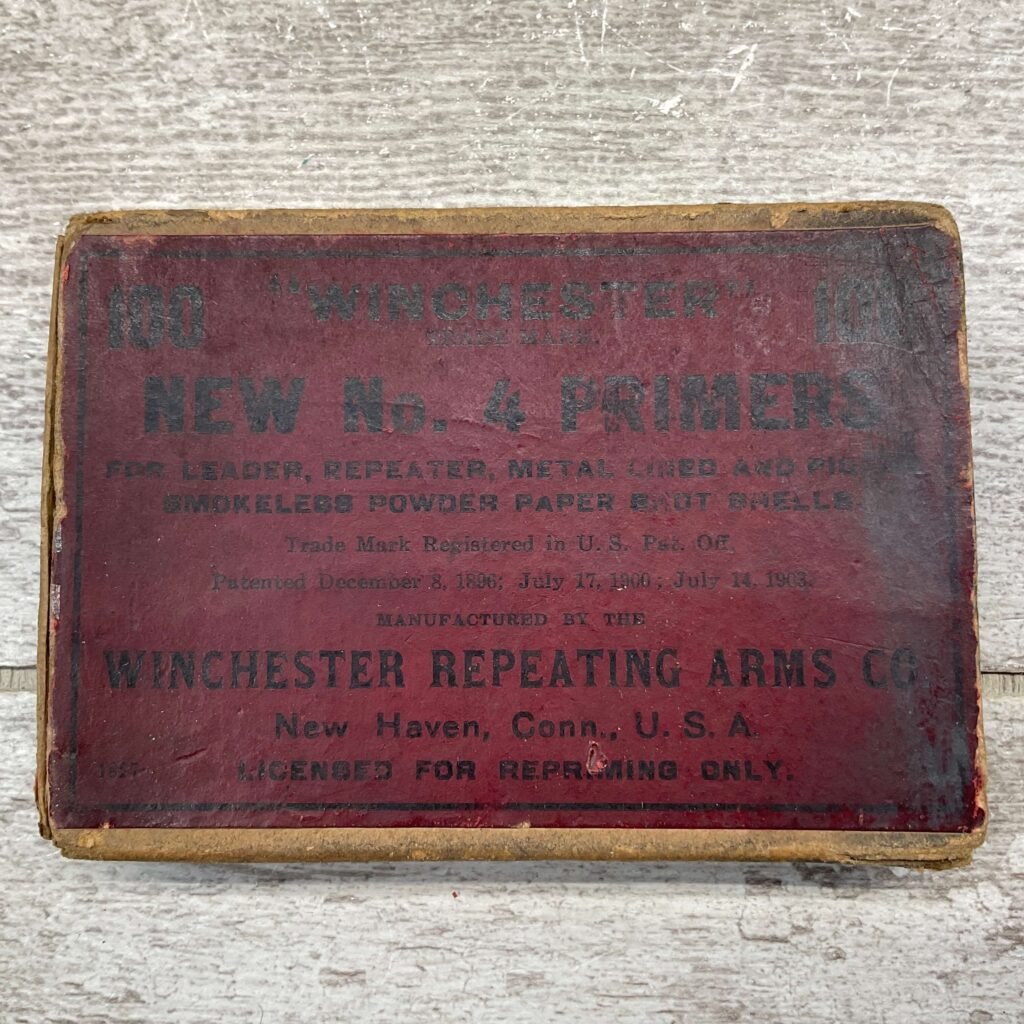 WINCHESTER ‘NEW’ NO. 4 PRIMERS, VINTAGE, QTY 94 #5-03016-PF, BOX IS IN GOOD CONDITION FOR AGE, SLIGHTLY WORN, PATENTED DECEMBER 6, 1896.
