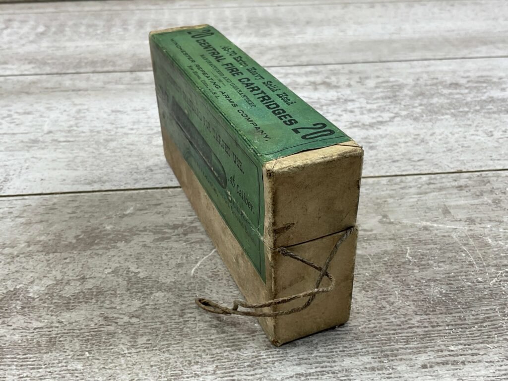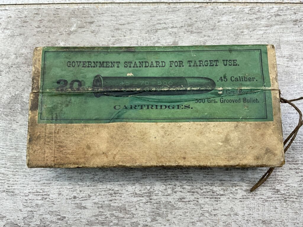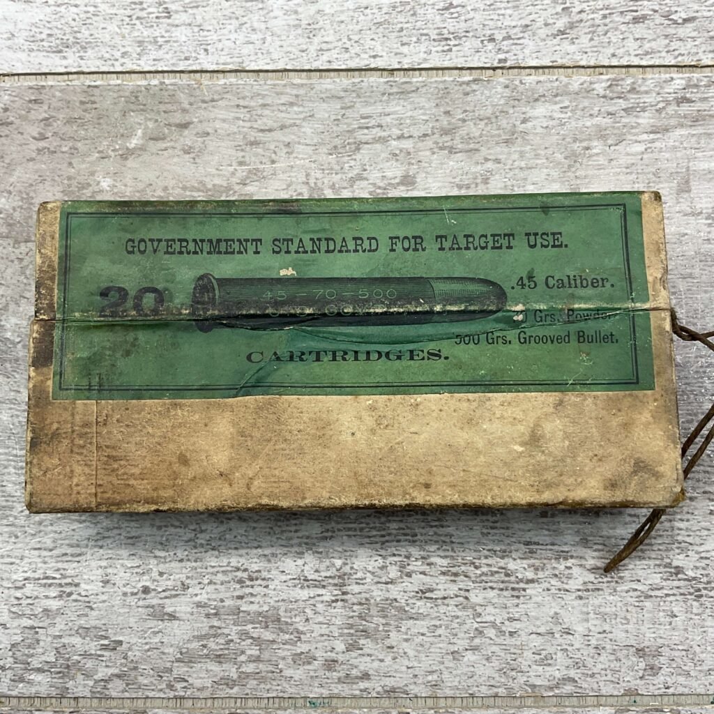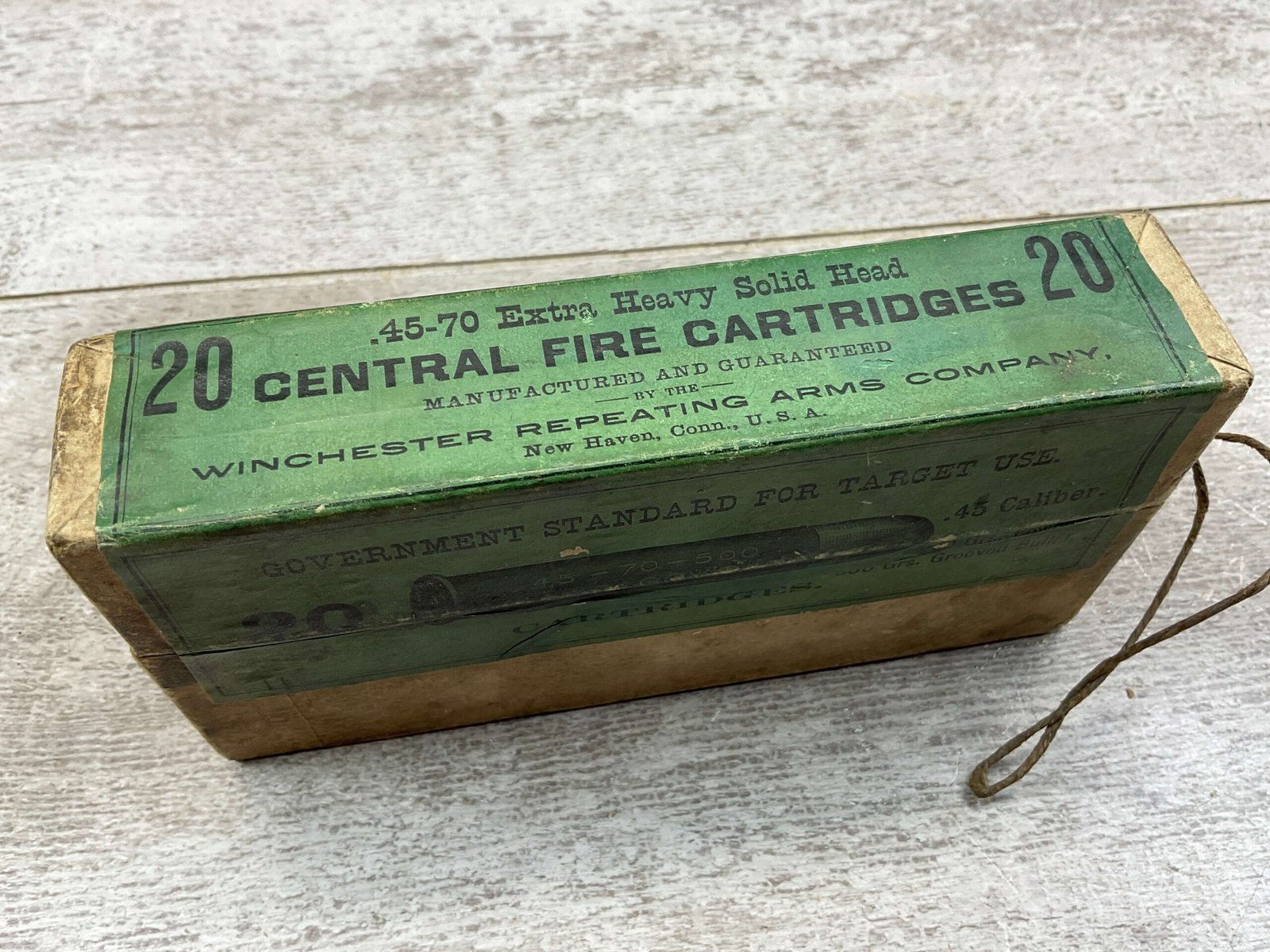 WINCHESTER GOV .45-70 CALIBER 500 GRAIN GROOVED BULLET, QTY 20, RARE, UNOPENED, BOX WINCHESTER REPEATING ARMS COMPANY, GOVERNMENT STANDARD, FOR TARGET USE .45-70 CALIBER, 500 GRAIN BULLET,  EXTRA HEAVY SOLID HEAD CENTRAL FIRE CARTRIDGES, QTY 20, BOX SHOWS NORMAL WEAR, COLORS AND TEXT IS IN EXC CONDITION, STRING TO OPEN THE BOX ARE STILL INTACT.
