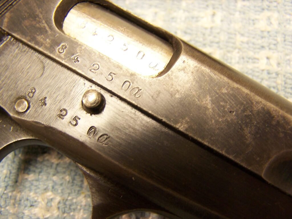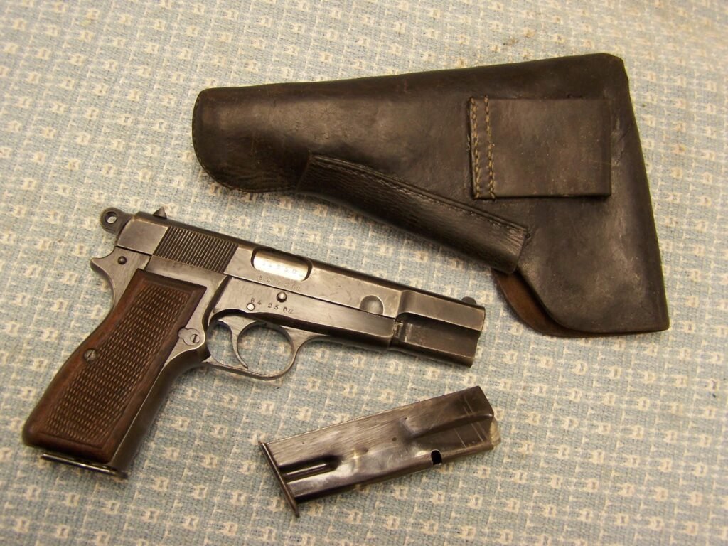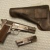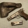 SKU#029 FN BROWING P35 HI-POWER 9mm #84250a, MATCHING, 1943 GERMAN MFR., 2 CORRECT WWII MAGS & dla44 BLACK HOLSTER, EXC. BORE, EXC. GRIPS, 85-90%