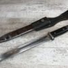 WWII GERMAN K98 BAYONET & METAL SCABBARD/FROG #1477e, 15″ OVERALL, 9 3/4″ BLADE LENGTH, BAKELITE GRIPS, SOME DINGS AND SCRATCHES, WaA218 NEAR PRESS-STUD BUTTON (BUTTON IS MISSING), VG OVERALL CONDITION, SCABBARD IS DENTED BUT BLADE INSERTS SMOOTHLY, SEE PHOTOS