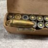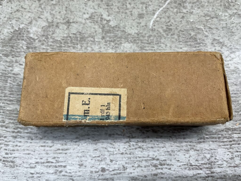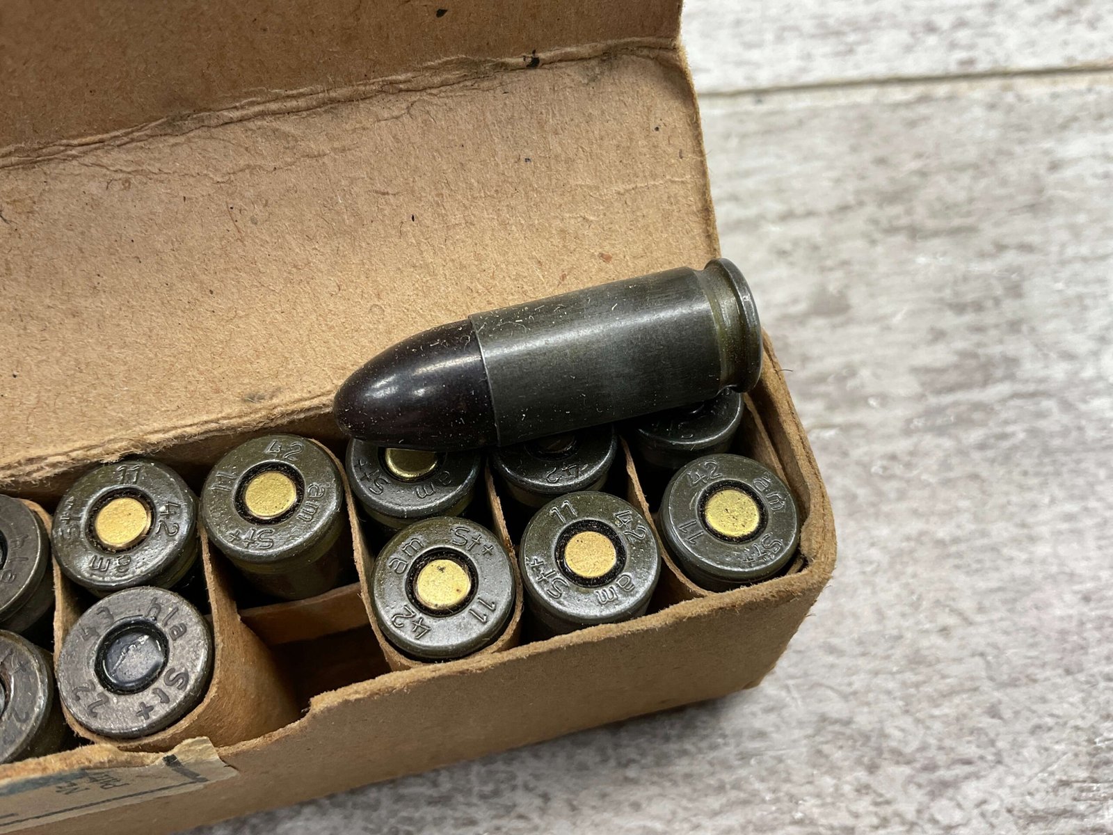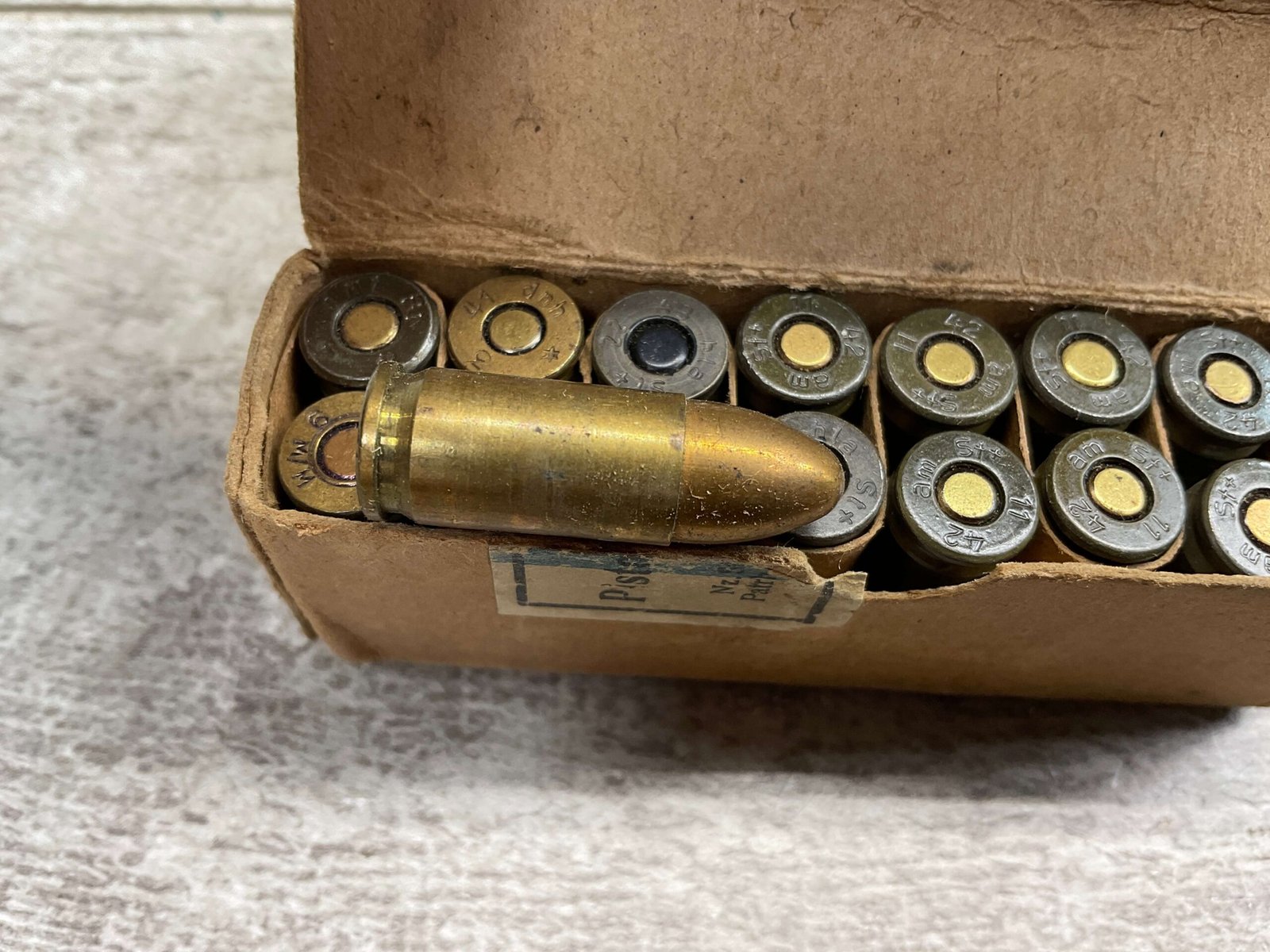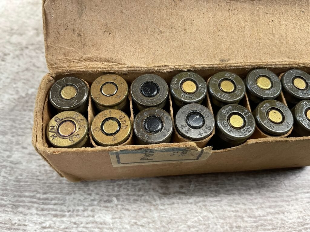 WWII PISTOLENPATRONEN 1943 GERMAN 9MM AMMO, QTY 16 CONTAINING 9 WITH HEADSTAMP “11 / 42 / AM / STT”, 3 WITH HEADSTAMP “22 / 43 / HLA / SLT”, 2 WITH HEADSTAMP “3 / 41 / DNH / *”, 1 WITH HEADSTAMP “BAE / 43 / 9MM ” AND 1 WITH HEADSTAMP “4 / 41 / DNT / ST”. BOX IS ALSO MARKED WITH SMALL PEN MARKING.