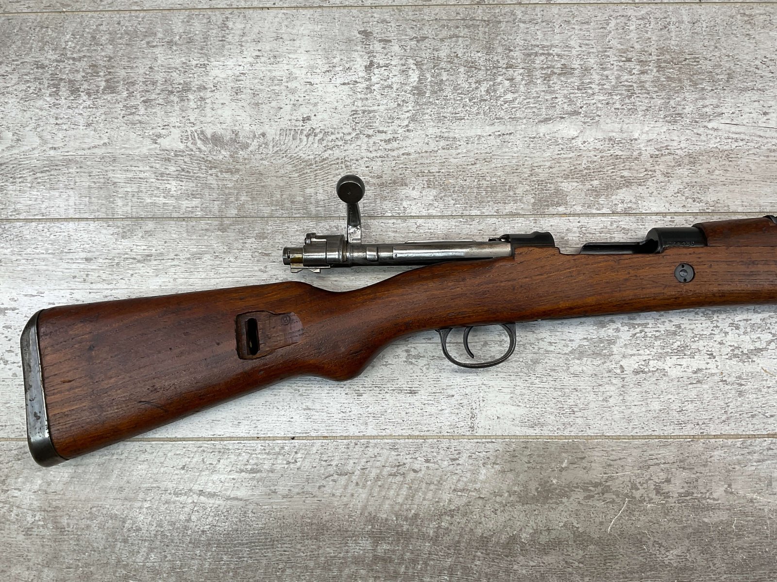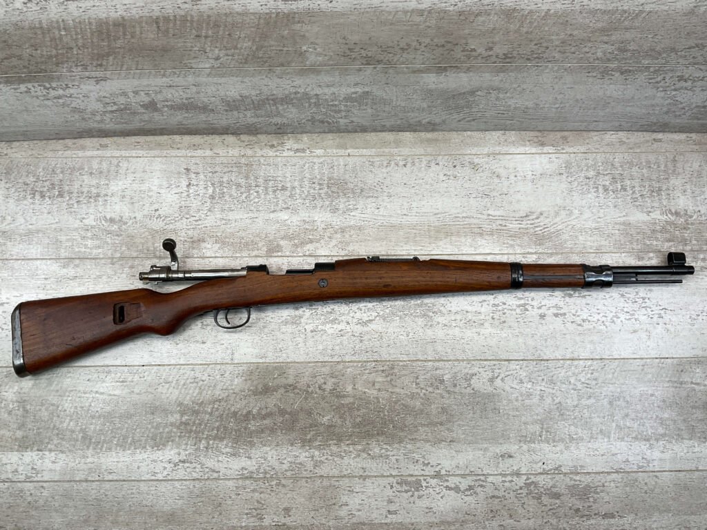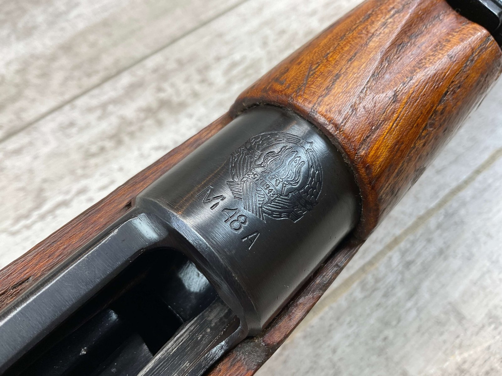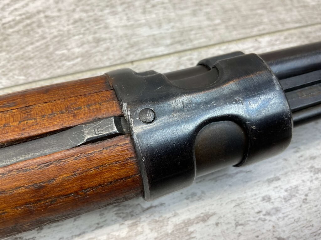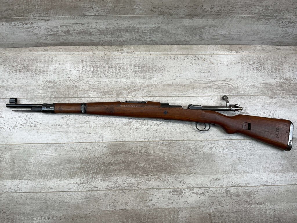 YUGO M48A 8MM BOLT ACTION SHORT RIFLE #r 24130, 8MM MAUSER, MANUFACTURED “RED FLAG FACTORY”, EVERYTHING MATCHES BESIDES THE BOLT, LIGHT CAI IMPORT MARK ON R SIDE OF BARREL, YUGO CREST ON TOP OF RECEIVER, PREDUZECE 44 STAMP ON LEFT SIDE OF RECEIVER, 23.5″ BARREL, EXC WOOD W/LIGHT NICKS & DINGS, 95% BLUE, 5 ROUND CAPACITY, FRONT SIGHT HOOD, BAYO LUG, CLEANING ROD, STEEL BUTTPLATE, BRIGHT BOREÂ W/EXC RIFLING & SCATTERED PITTING THROUGHOUT, 95% OVERALL